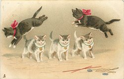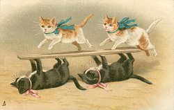 cat standing, holds two sticks, kitten jumps through sticks, another front runs right