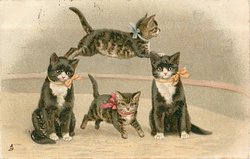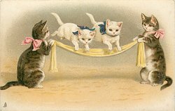 two cats sit up on hindlegs streching scarf between them, two kittens leap over