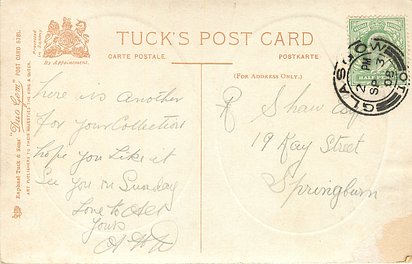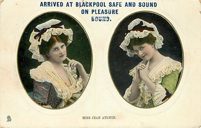 comes opt. in blue ARRIVED AT BLACKPOOL SAFE AND SOUND ON PLEASURE BOUND (1885 Hawick Scotland -1964 Kent, Eng ) An Actress and Singer once described as Lady Harry Lauder.
