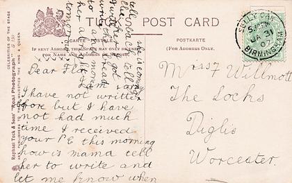 PHOTO BIOGRAPH, standing, large hat frilly dress, she faces front & looks up, hand-coloured, same image P333