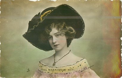 PHOTO JOHNSTON & HOFFMAN, head & shouilders study, enormous hat, faces & looks front, hand-coloured Gabrielle Ray 1883 Eng.- 1973 Surrey, Eng. After being in many top plays she, after a failed marriage to Eric Loder 1912- div 1914, was in a mental hospital nearly 40 yrs.
