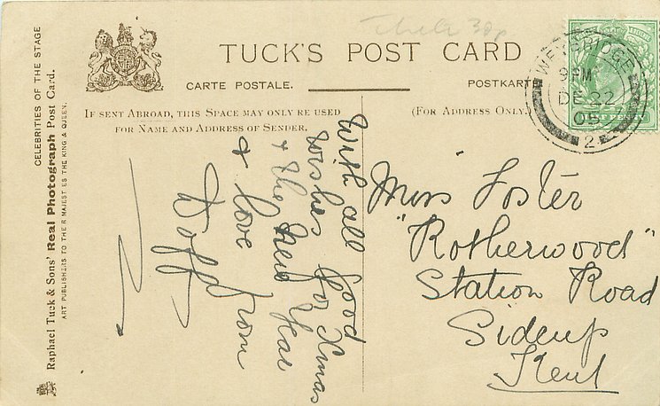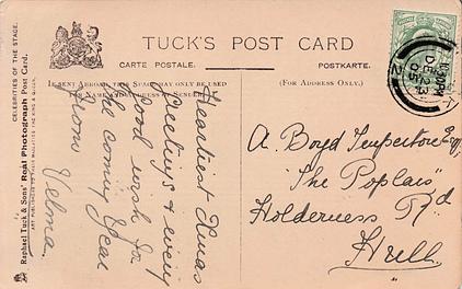 PHOTO JOHNSTON & HOFFMANN, hand-coloured,come opt. A HAPPY CHRISTMAS Freda Vivian was Mychellah in " The Cingalee" Musical Play Daly's Th .London 1905 (365)