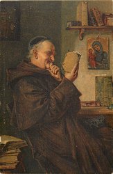 three quarter length study of monk sitting at table facing right, reading book held up in his right hand