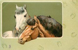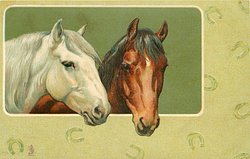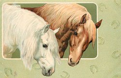 heads of two horses in inset- white horse left, brown horse right, brown horse extends past border