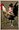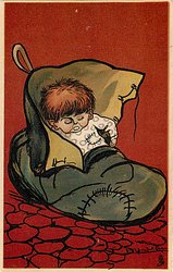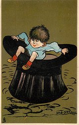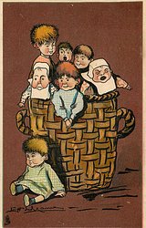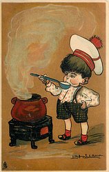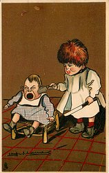 small child sits in wood chair yelling while another stands right with knife and brush in hand
