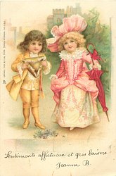 girl in very elaborate pink/white outfit carrying red furled parasol right, boy in golden outfit holds triangular hat left