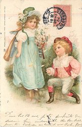 girl in blue & white dress stand left carrying white flowers, boy in pink & white sits right