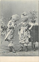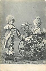boy left holds antique wheeled carriage, girl sits in it holding potted plant