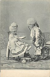 boy stands looking down through lorgnettes at little girls who is seated reading
