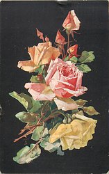 stalks to lower left, two yellow roses above, one orange/pink below, wo pink buds middle right