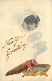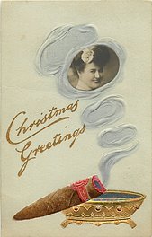 CHRISTMAS cigar in ashtray, pretty girl face inset into smoke