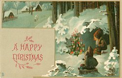 A HAPPY CHRISTMAS two dwarves sit round christmas tree in snow