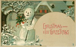 CHRISTMAS GREETINGS snowman, snow scene, lighted cottage