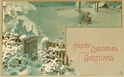MERRY CHRISTMAS GREETINGS dwarf walks away to distant cottage