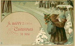 A HAPPY CHRISTMAS TO YOU , dwarf Santa clears snow from sign by snowy road, crow observes