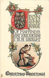 UPON THE FORGE OF HAPPINESS MAY YOUR FORTUNE E'ER BE WROUGHT inset blacksmith with CHRISTMAS GREETINGS below