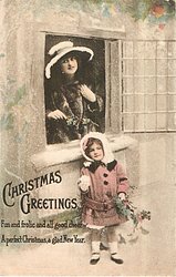 CHRISTMAS GREETINGS girl stands holding snowball & holly, mother in window behind