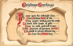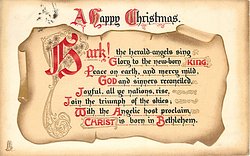 A HAPPY CHRISTMAS HARK! verse on weathered scroll