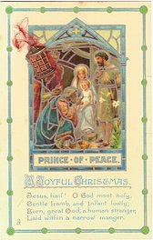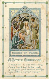 A JOYFUL CHRISTMAS verse:- JESUS, HAIL! O GOD MOST HOLY, GENTLE LAMB, AND INFANT LOWLY//MANGER., comes with brass charm applique same basic image comes as Tuck Ephemera greeting card, artist