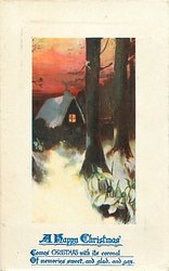 A HAPPY CHRISTMAS lighted cottage, snowdrops