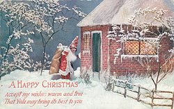 A HAPPY CHRISTMAS Santa carrying sack, house right