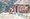 A HAPPY CHRISTMAS Santa carrying sack, house back/right