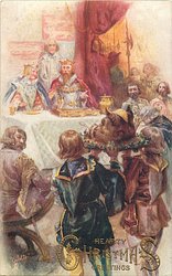 HEARTY CHRISTMAS GREETINGS, medieval King & Queen at table, boars head carried forward