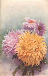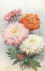 white mum lower right, then pink with white centre, then orange, pink mum at back