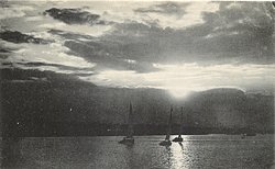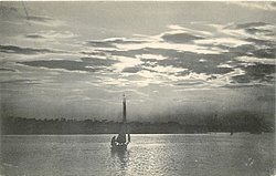 yacht on lake at sunset, one figure in stern