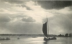 boat under sail moves to left, two figures at base of mast