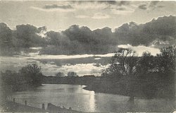 river at sunset, trees on both banks, prominent dark clouds
