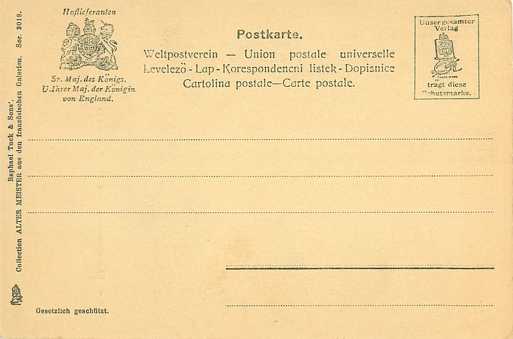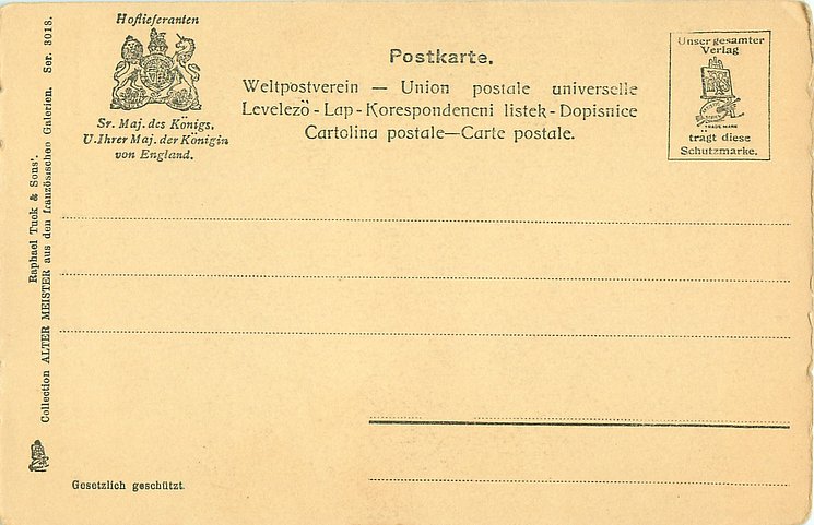 u/b, brown/purple,UN MOT A LA POSTE, (DEPOSE), same image & number, German/International back 3018 COLLECTION ALTER MEISTER AUS DEN FRANZOSISCHEN GALERIEN with inscription,front title & artist in French