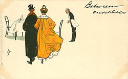 BETWEEN OURSELVES man & women walk to secluded table for two