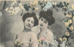 two pretty girls in off shoulder dresses stand close under floral arch, girl left reaches up with her right hand to touch flowers, girl on right has hands on the others shoulder