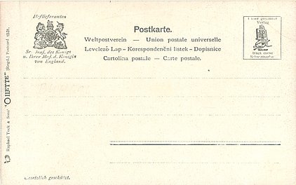 OILETTE German/International back, u/b, GESETZLICH GESCHUTZT, same image OILETTE German/International back 129 English back OILETTE 1531 ENGLISH COTTAGE HOMES, French back RAFAELETTE 581 INTERIEURS BRETONS & PHOTOGRAVURE unnumbered