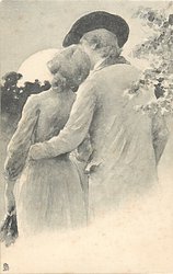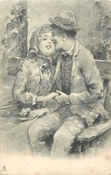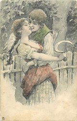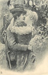 girl bends forward looking back to man behind, with feather in cap, who almost kisses her
