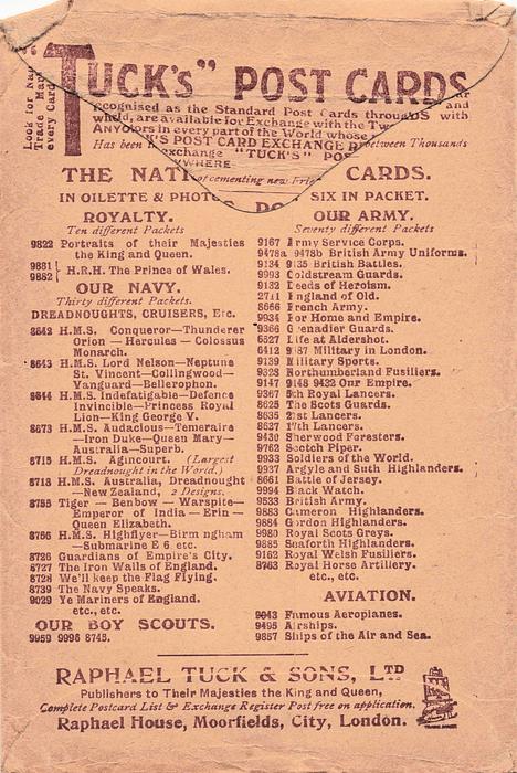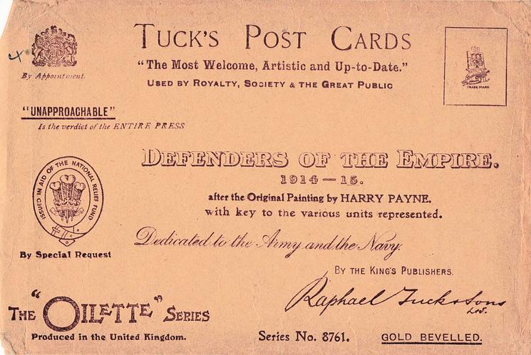 in oval crest ISSUED IN AID OF THE NATIONAL RELIEF FUND, on back KEY TO THE UNITS REPRESENTED comes opt. in blue VICTORY