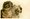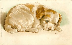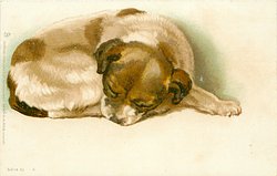 white puppy with brown head, white muzzle, lies asleep facing right, head front
