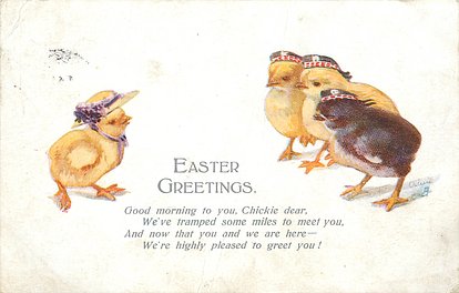 verse:- GOOD MORNING TO YOU CHICKIE DEAR, WE'VE TRAMPED SOME MILES TO MEET YOU, AND NOW THAT YOU AND WE ARE HERE - WE'RE HIGHLY PLEASED TO GREET YOU!