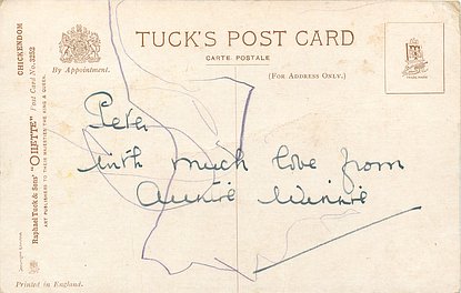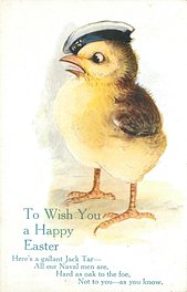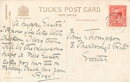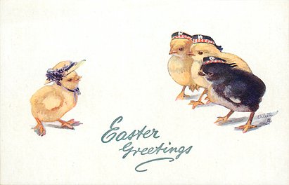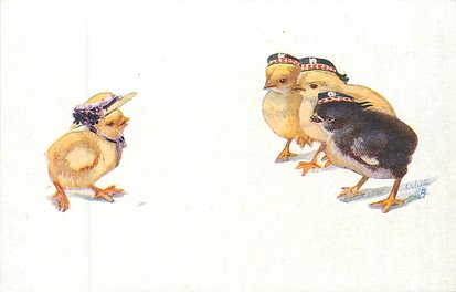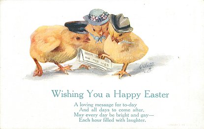 OILETTE, PRINTED IN ENGLAND, COPYRIGHT LONDON, 2 backs, also come titled IN CHICKENDOM, come with Easter greetings