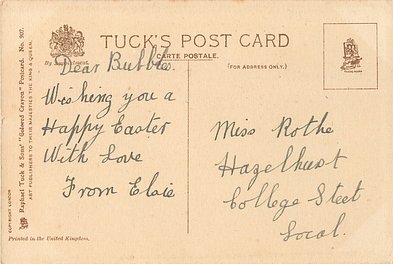 verse. front top:- FLOWERS OF FAIREST PUREST HUE BLOOM TO GRACE GLAD EASTERTIDE. PEACE, JOY, HOPE SPRING UP ANEW AND IN YOUR HEART FOR AYE ABIDE