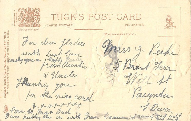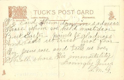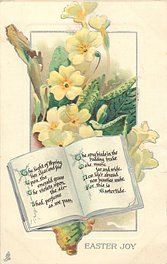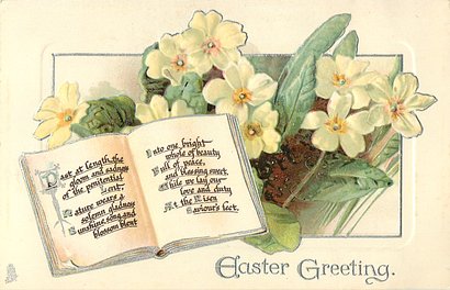 verse:- THE LIGHT OF SPRING LIES CLEAR AND FAIR UPON THE EMERALD GRASS THE VIOLETS UPON THE AIR//THIS IS EASTERTIDE.