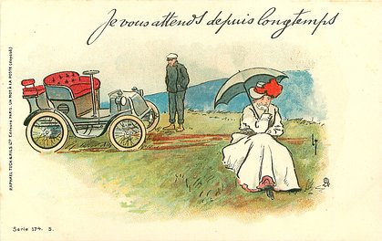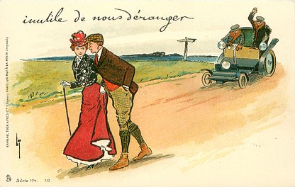 man and woman walk behind car on farm wagon, same image, English back 641 IT'S RATHER FORTUNATE or 1790 THE JOYS OF A MOTOR