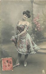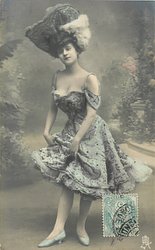 pretty brunette in off shoulder blue costume, skirt held up with both hands, faces half left, large hat