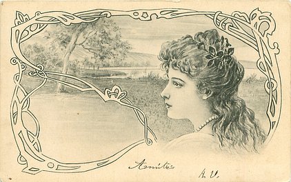 en pleine air (1904 list) , nouveau designs, women's heads sorrounded by ornate designs against rural backgrounds