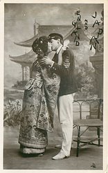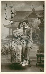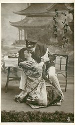 ENGLAND AND JAPAN man in naval uniform and Japanese woman kissing, man sits on bench, woman on knees