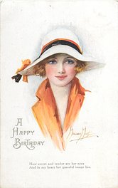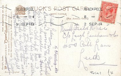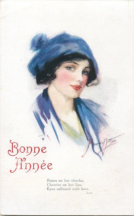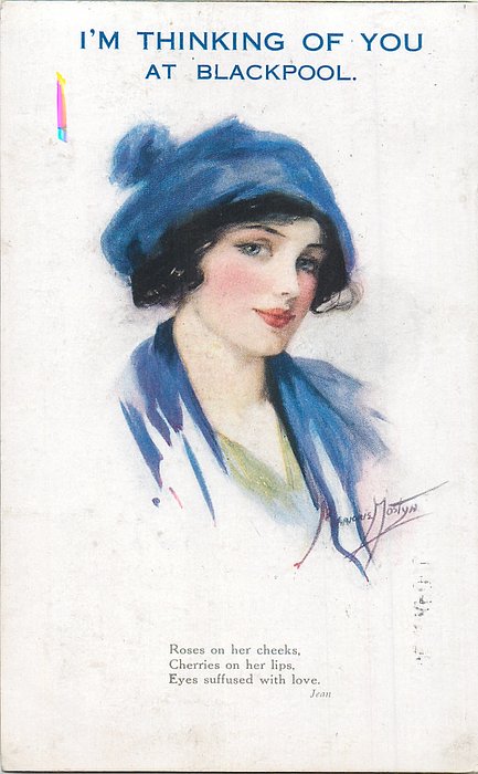 verse:- ROSES ON HER CHEEKS, CHERRIES ON HER LIPS, EYES SUFFUSED WITH LOVE. quote JEAN. opt. in red BONNE ANNEE, opt. in blue I'M THINKING OF YOU AT BLACKPOOL, over print BIRTHDAY GREETINGS, photo courtesy of Magne Botnedal