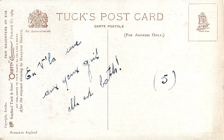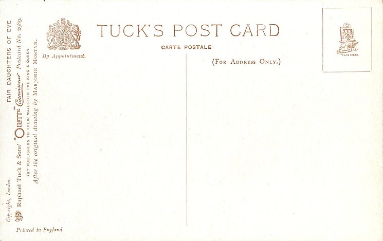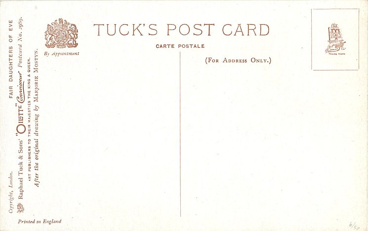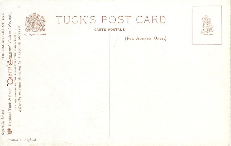 OILETTE CONNOISSEUR, COPYRIGHT LONDON, PRINTED IN ENGLAND, come with & w/o quotes, AFTER THE ORIGINAL DRAWING BY MARJORIE MOSTYN.