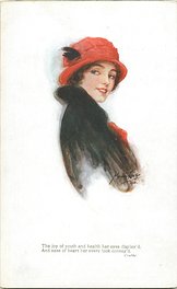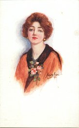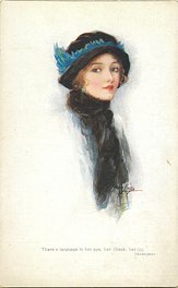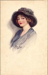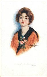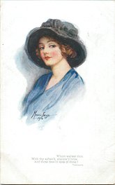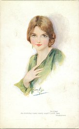 OILETTE CONNOISSEUR, COPYRIGHT LONDON, PRINTED IN ENGLAND, 3 backs, come with & without quote on bottom of each card, AFTER THE ORIGINAL DRAWING BY MARJORIE MOSTYN.. listed in1930 POSTCARD Catalogue