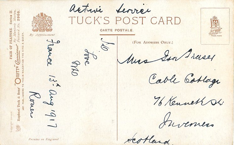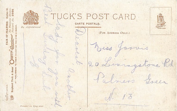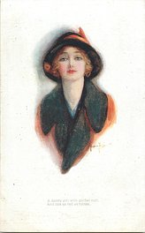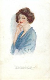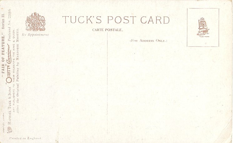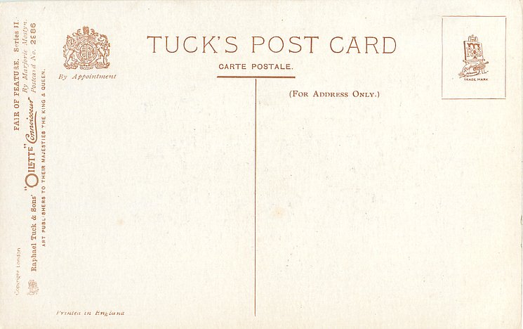 OILETTE CONNOISSEUR, COPYRIGHT LONDON, PRINTED IN ENGLAND, 3 backs, come with & without quote on bottom of each card, BY MARJORIE MOSTYN. listed in1930 POSTCARD Catalogue